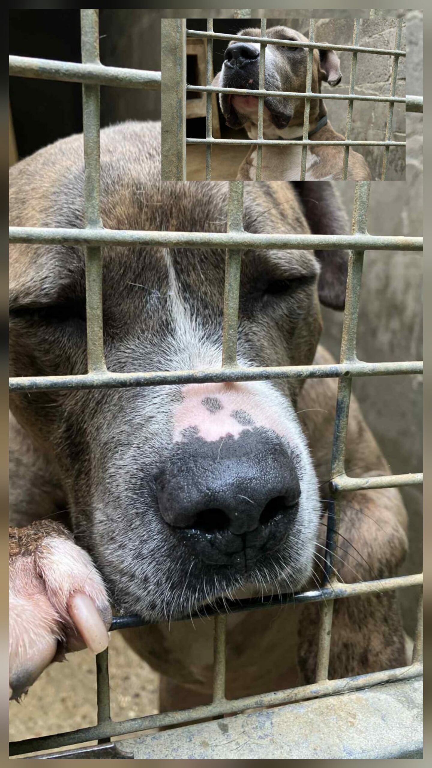 En ce moment ce n’est pas trop la joie pour moi, je souffre énormément de mon enfermement et pour qu’on se préoccupe de mon malheur je n’hésite pas à pleurer et grignoter la porte en ferraille de mon box, aboyer de toute mon âme quand on passe devant mon box, chercher le regard de quelqu’un.